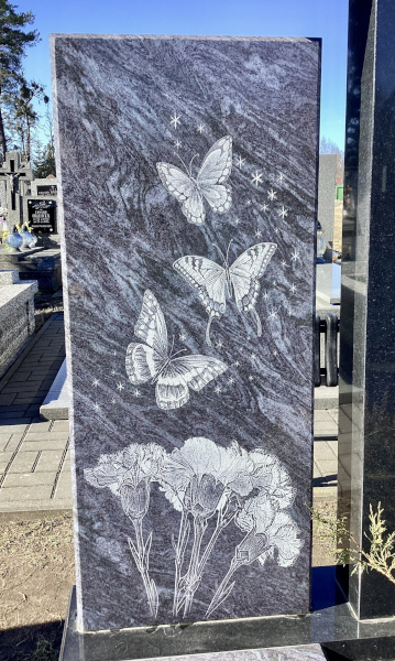 Stela z sylwetkami motyli na mogile Krzysztofa Sikorskiego. (Marzec 2026 r.). Fot. Piotr Bajko.